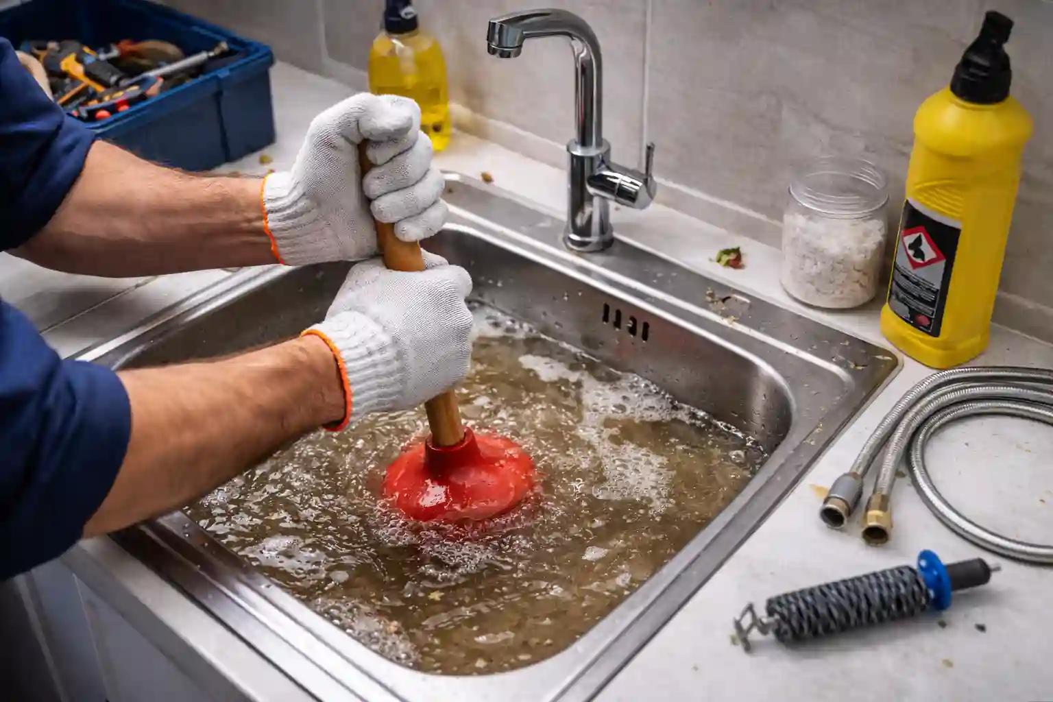 Evita usar agua, aísla el área por riesgo sanitario y solicita urgencia. Suele indicar obstrucción en tramo principal.